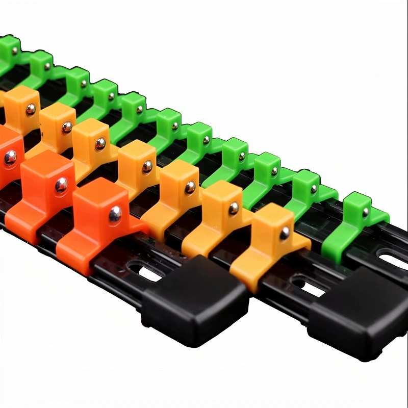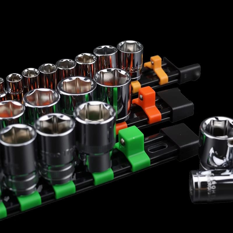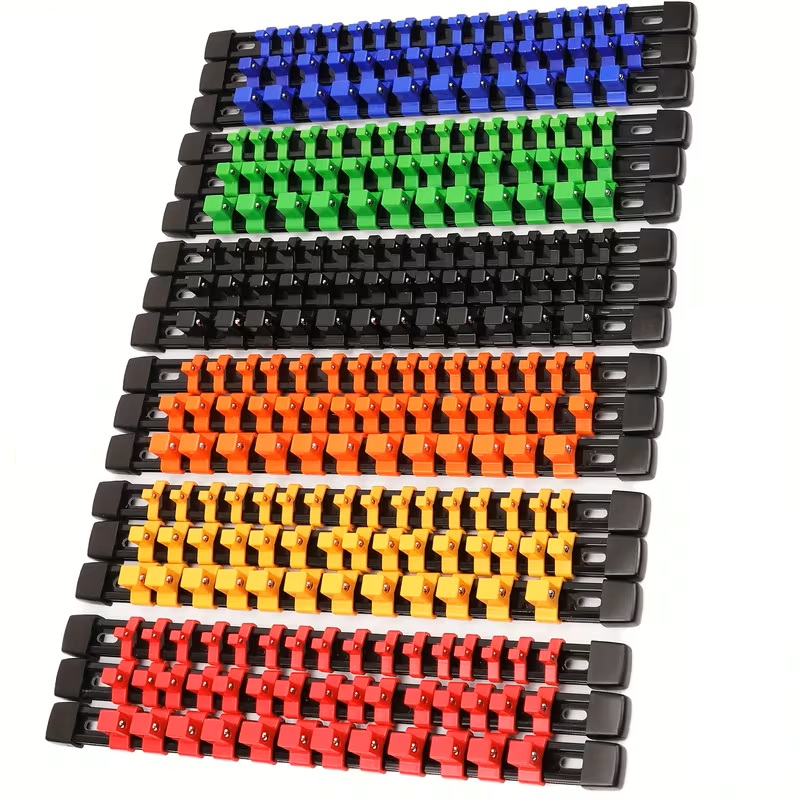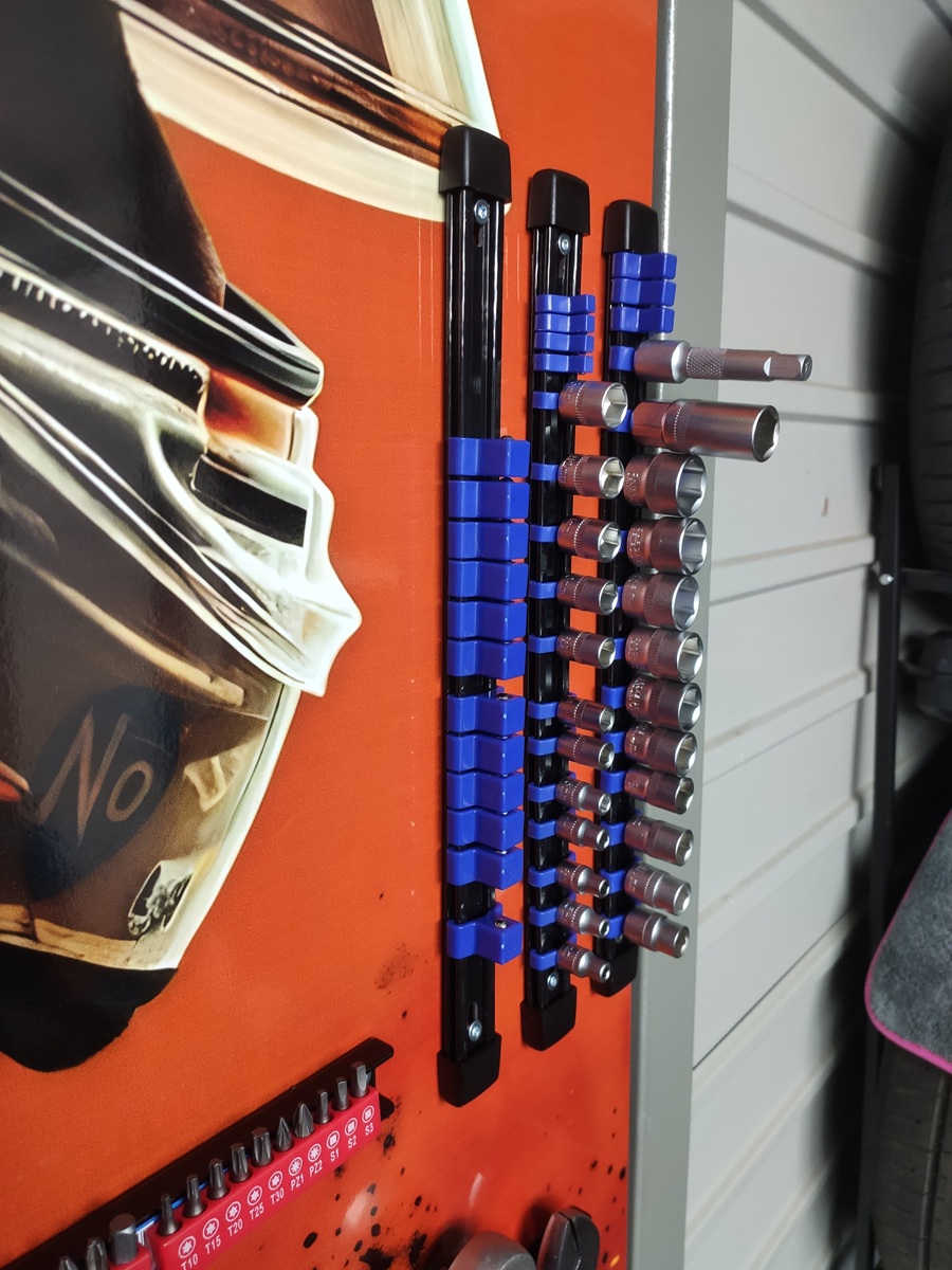 Ten organizer ma metalową szynę i trzpienie z twardego plastiku z metalową kulką trzymającą nasadki na miejscu. Trzpienie można przesuwać po szynie i ustawiać w dowolnym punkcie. Nie zjeżdzają gdy ustawione w pionie (patrz zdjęcie). Wykonany ze stali malowanej proszkowo — nie rdzewieje co w warunkach podwyższonej wilgoci w garażu blaszanym ma szczególne znaczenie, nie odkształca się pod ciężarem narzędzi i wytrzymuje codzienne użytkowanie w warunkach warsztatowych. Solidna konstrukcja, której nie musisz wymieniać co sezon.